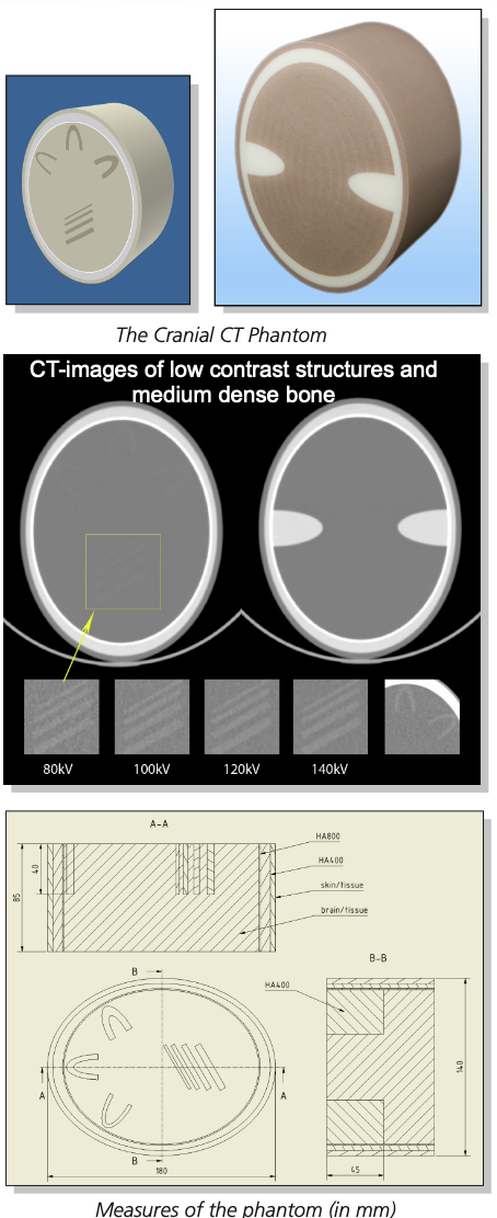 基于一个软组织等效塑料与一个恒定的ct数为不同的kV设置以及周围的骨骼结构,其x射线吸收与人类头骨相似,两个 人类大脑的不同部分被实现。其中一部分描述了头骨的底部,有均匀的软组织和相当于颞骨的骨结构。这部分适合演示和评估头骨底部的图像质量,特别是受光束硬化效应、部分体积效应和扫描仪不稳定(如阳极摆动)引起的伪影影响。