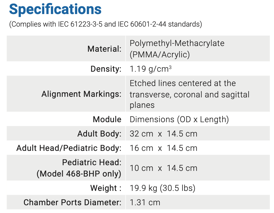 CTDI模体的设计符合食品和药物管理局(FDA 21CFR 1020.33)和国际电工委员会(IEC 60601-2-44)概述的规格。CTDI模型468-BPH支持儿童和成人计算机断层扫描剂量指数(CTDI)。其他测试包括CTDI100(中心和外围)CTDIw、CTDIvol和CTDI自由空气。