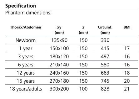 小儿幻体有一个中央可更换的插入物,调整到幻体的大小。包括一个具有剂量孔的组织等效插入物。可选的图像质量测试插入(例如,低对比度,空间分辨率等)可以作为定制解决方案要求。