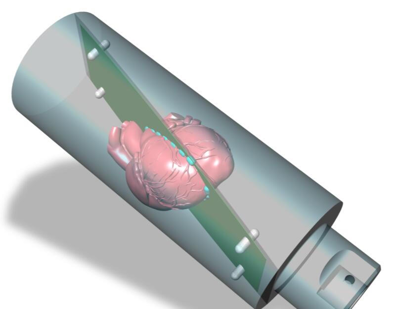 心脏体模由组织等效胸腔体、内嵌固体组织等效心脏的运动杆、运动执行器、运动控制器和CIRS运动控制软件构成。