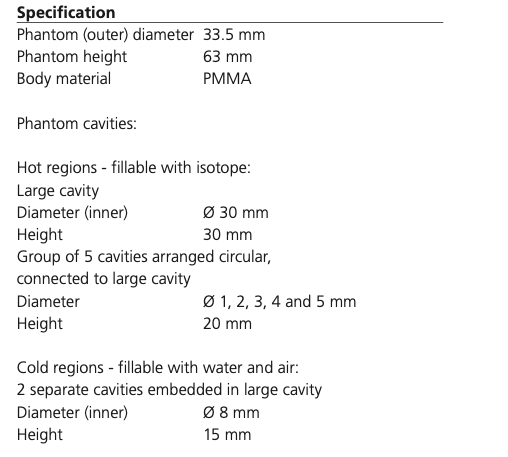 模体由PMMA制成,在模体的一半有一个大腔(Ø = 30 mm),可以填充放射性同位素(热区)。这个大的空腔容纳了两个可以充满水和空气的小空腔(寒冷地区)。另一半的模体包含5个直径不同的小空腔(Ø = 1,2,3,4和5mm),它们围绕幻体的纵轴圆形排列,连接到第一个大的放射性元素填充的空腔(热区)。