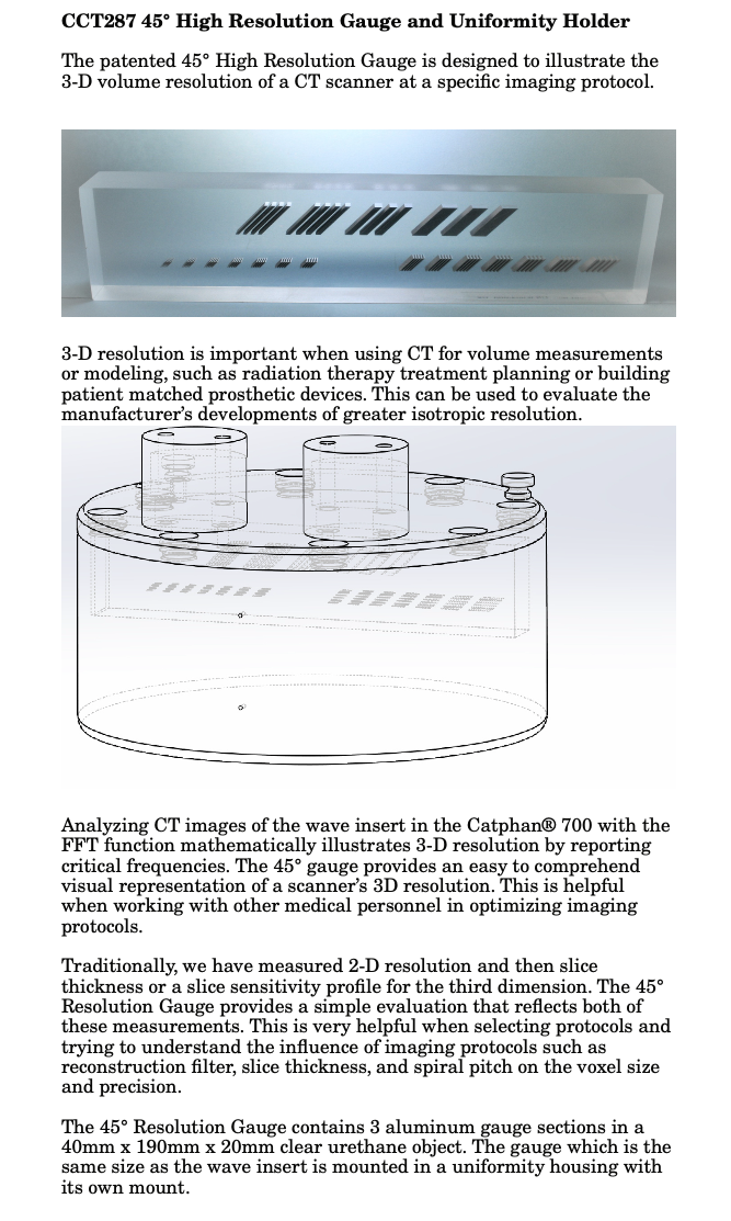 此外,幻影还包含新的波插入,用于测量扫描区域的切片几何形状和分辨率。为了解决由于扫描仪x轴和y轴的测试模式方向可能产生的变量,幻影有一个新的旋转支架,使安装的幻影能够以45°的间隔旋转360°。