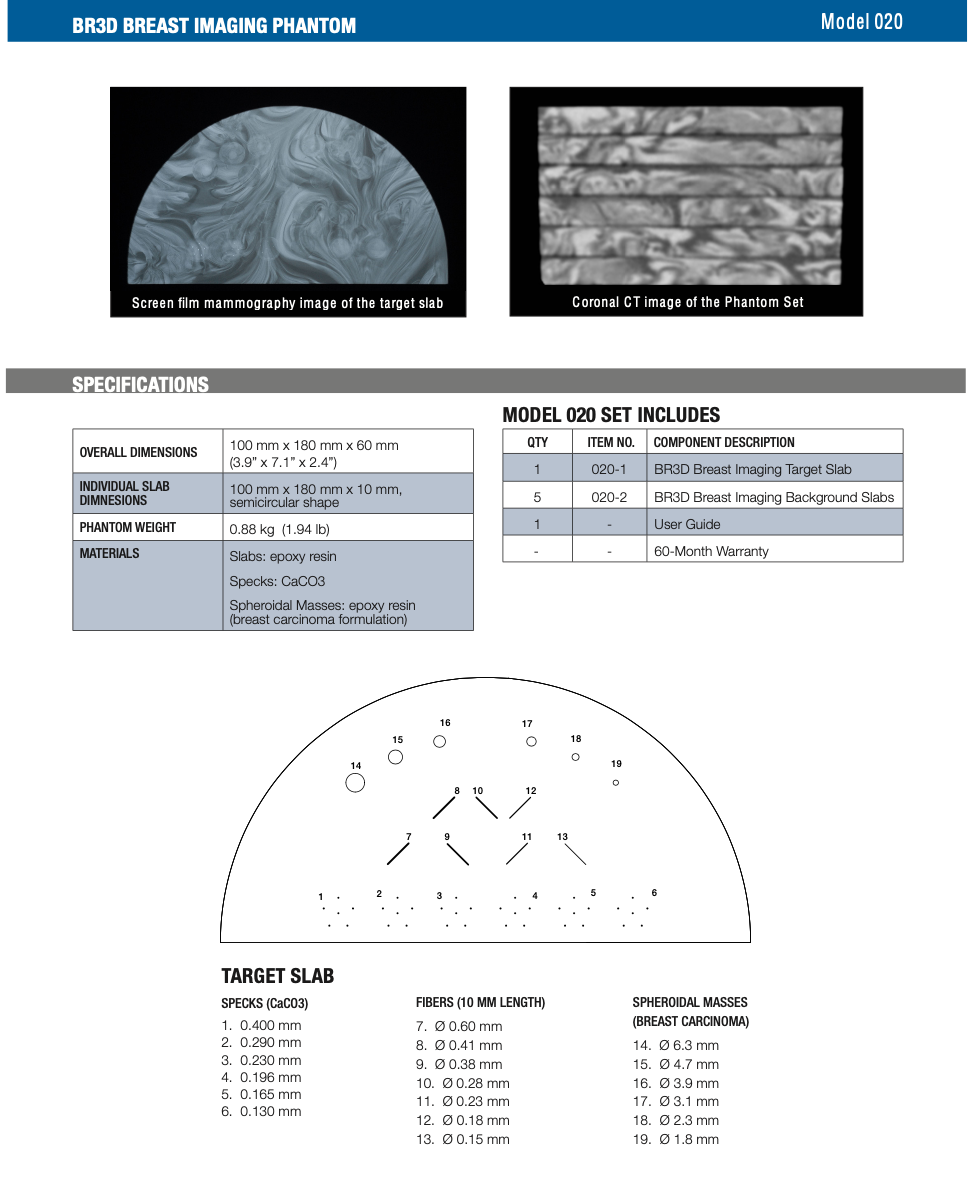 020模型包含6个异质的,乳房等量的平板,准确地展示了潜在的目标是如何可以被不同的腺体所遮蔽。每块板由两种模拟100%脂肪的组织等效材料组成100%的腺体组织以大约50/50的重量比例“旋转”在一起。因为每一块板都有独特的漩涡图案,幻影可以排列成多个背景。一块石板上有各种各样的微型钙化,原纤维和肿块,可以定位在不同的深度。每个半圆形的平板测量