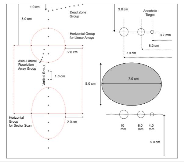 模体结合了单丝线目标,6个不同大小的非回声圆柱目标和一个3D蛋形目标结构。单丝靶直径为0.12 mm,排列成四组直线靶,用于评价垂直和水平标定测量值、轴向-横向分辨率和死区。